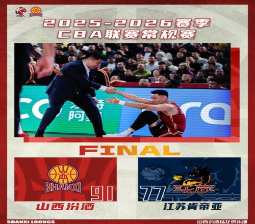 北京时间2026年1月4日19:35,2025-2026赛季CBA联赛第十轮继续进行,山西汾酒主场对阵江苏肯帝亚。两队历史上共交手39次,山西汾酒23胜16负,上赛季常规赛两队交手2次,山西汾酒2胜0负。本场比赛,山西队虽然一直保持领先,但在篮板球的拼抢和保护上依旧存在问题,仍需赛后进一步总结,最终全场比赛结束,山西汾酒91:77战胜江苏肯帝亚。